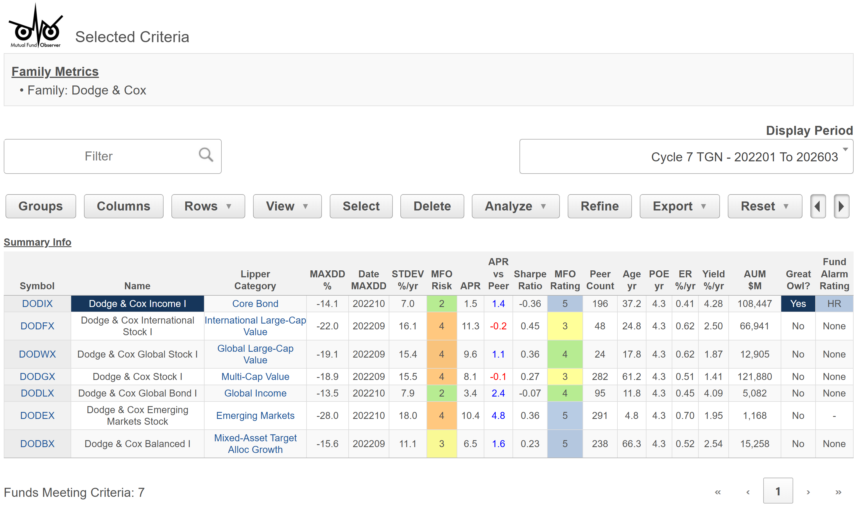 MultiSearch, our main search tool, will sort through thousands of funds based on up to 300 screening criteria. Its Pre-Set Screens provide an easy way to get a quick overview on markets and notable funds. The example below depicts risk and return metrics for the Dodge & Cox fund family during the current market cycle, coined "The Great Normalization." Only a few of the more than 1000 metrics available in the table are illustrated.