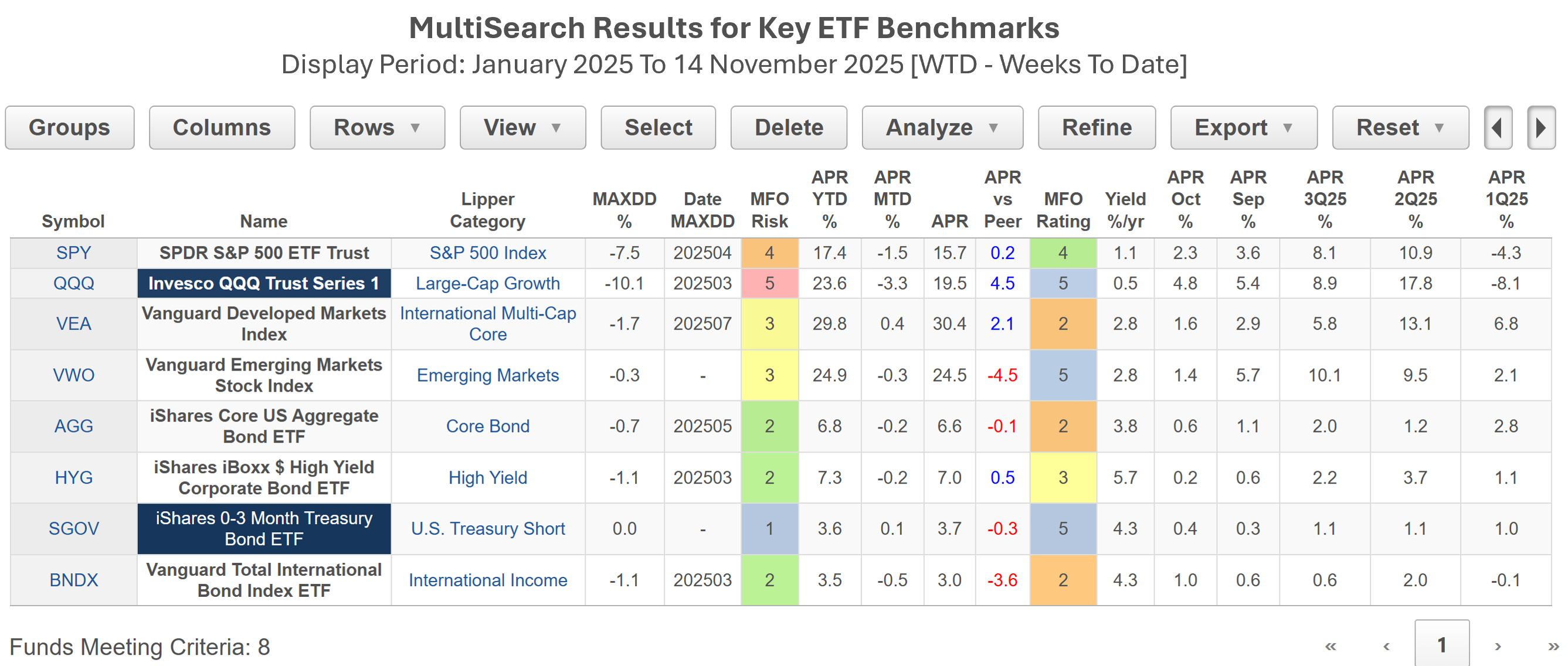 - A suite of analytics: Flows, Correlation, Rolling Averages, Up/Downside Capture, Calendar Year and Fixed Period Metrics, Batting Averages, Benchmark Comparisons, Trend and Momentum, Lipper Leaders, Category Averages and Ferguson Metrics.