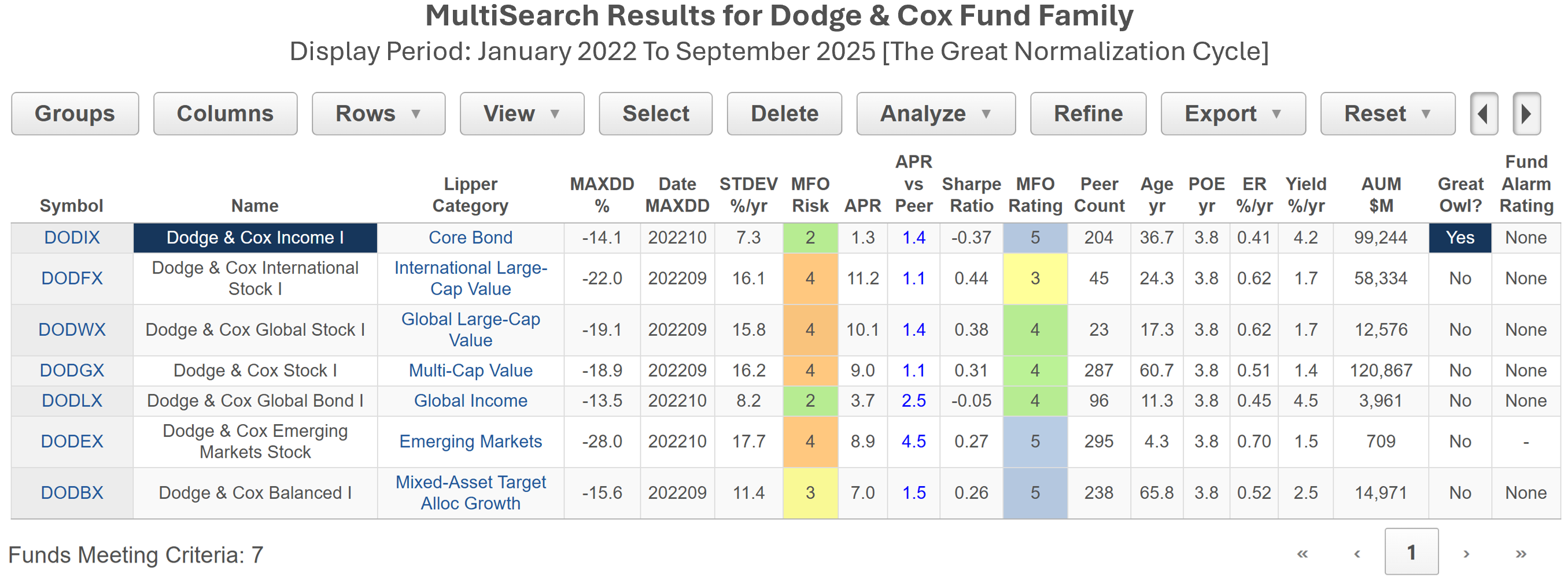 MultiSearch, our main search tool, will sort through thousands of funds based on up to 300 screening criteria. Its Pre-Set Screens provide an easy way to get a quick overview on markets and notable funds. The example below depicts risk and return metrics for the Dodge & Cox fund family during the current market cycle, coined "The Great Normalization." Only a few of the more than 1000 metrics available in the table are illustrated.