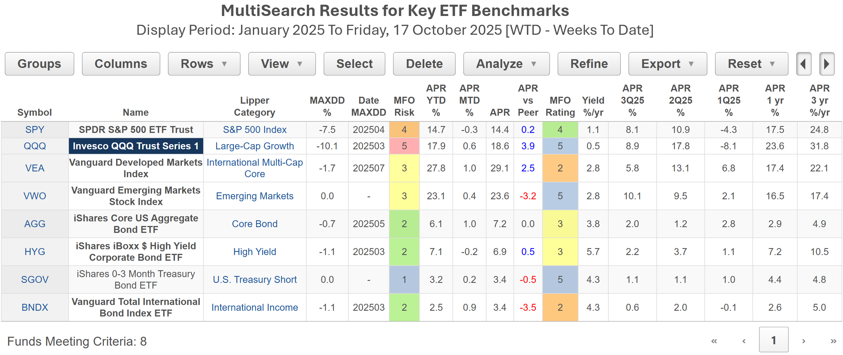 - A suite of analytics: Flows, Correlation, Rolling Averages, Up/Downside Capture, Calendar Year and Fixed Period Metrics, Batting Averages, Benchmark Comparisons, Trend and Momentum, Lipper Leaders, Category Averages and Ferguson Metrics.