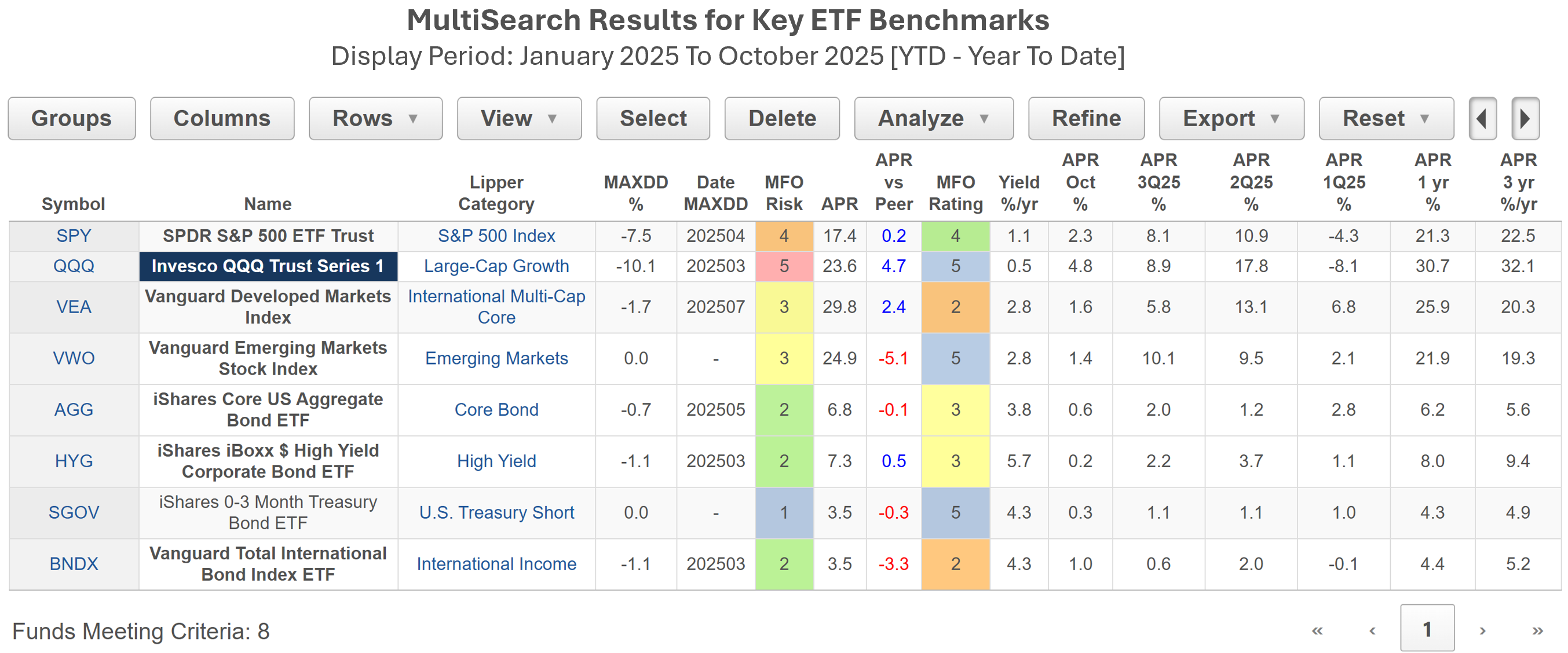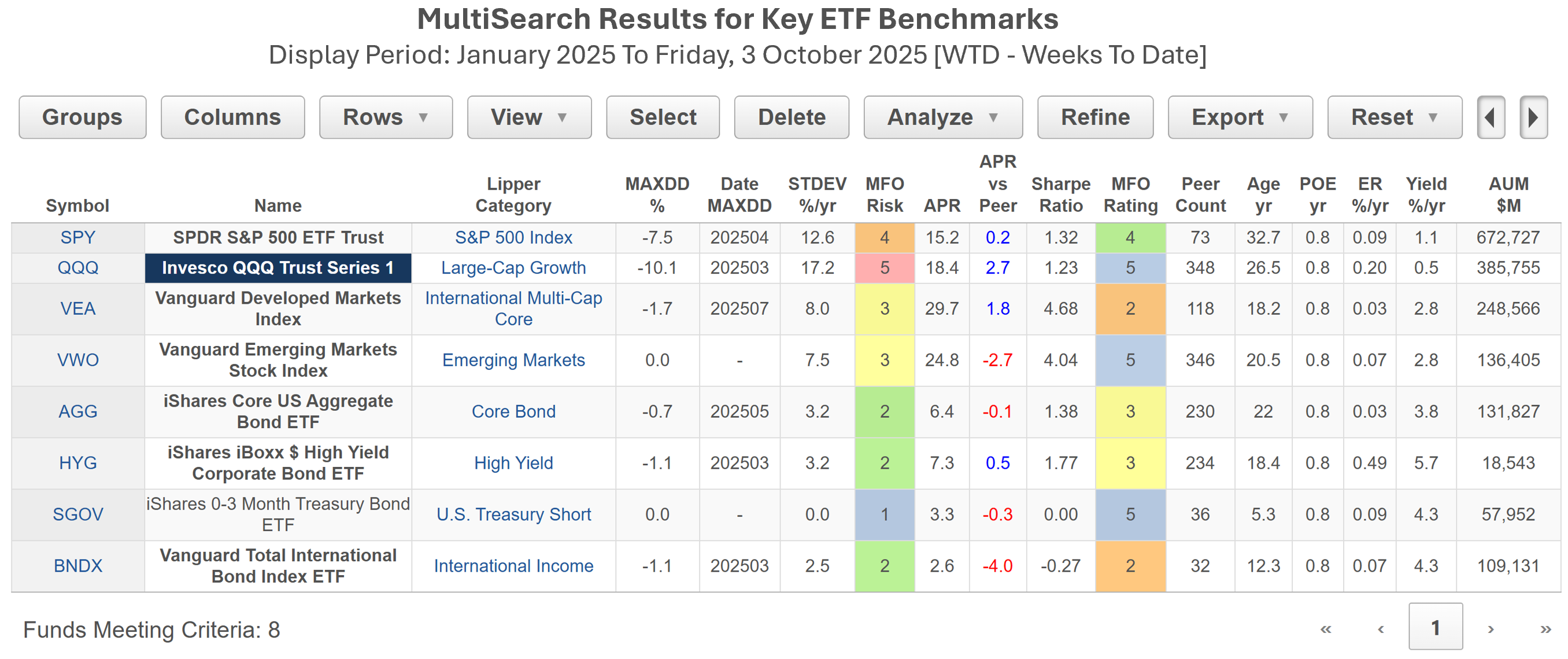 - A suite of analytics: Flows, Correlation, Rolling Averages, Up/Downside Capture, Calendar Year and Fixed Period Metrics, Batting Averages, Benchmark Comparisons, Trend and Momentum, Lipper Leaders, Category Averages and Ferguson Metrics.