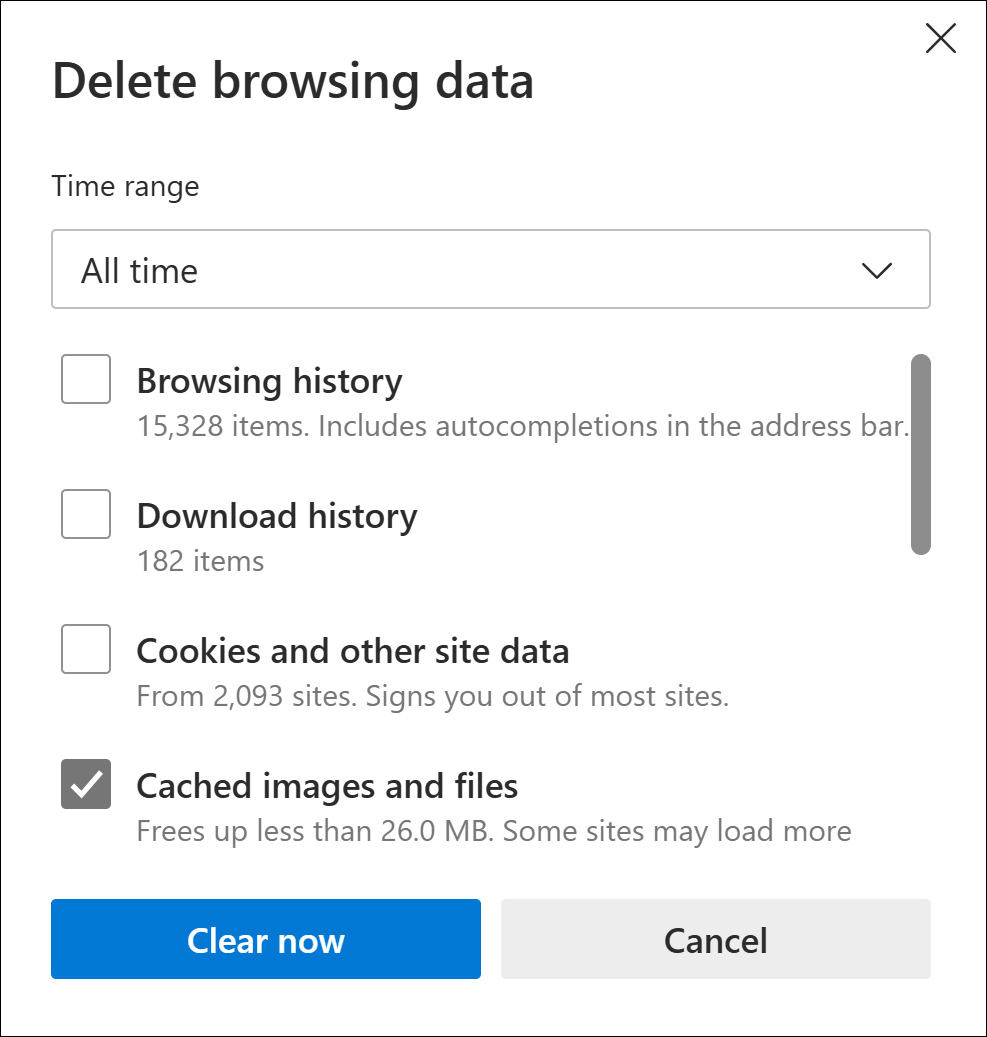 To clear the cache, users can typically hold the Ctrl-Shift-Delete keys simultaneously and a "Delete browsing data" panel should appear, like the one shown below. Look to check the option for "Cached images and files" versus say cookies, then hit "Clear now." If the Ctrl-Shift-Delete shortcut does not work, try this helpful link to manually clear cache for various browsers and operating systems: Clear Cache Manually. Note that restarting your device is another way to clear cached images and files.
