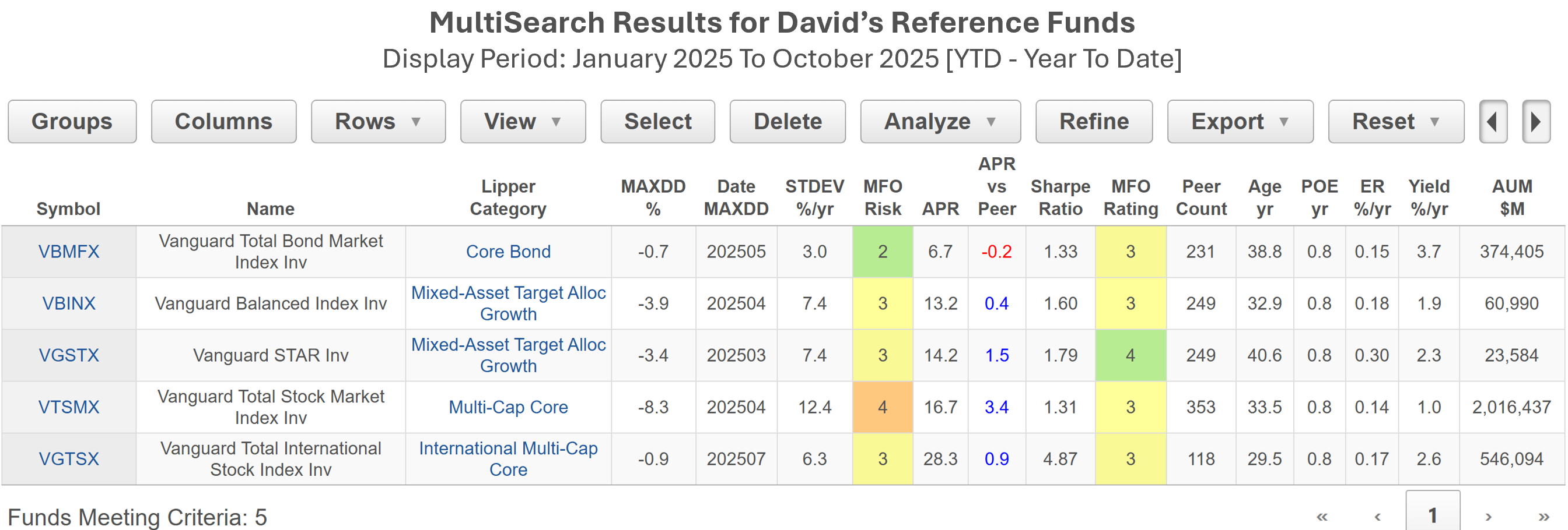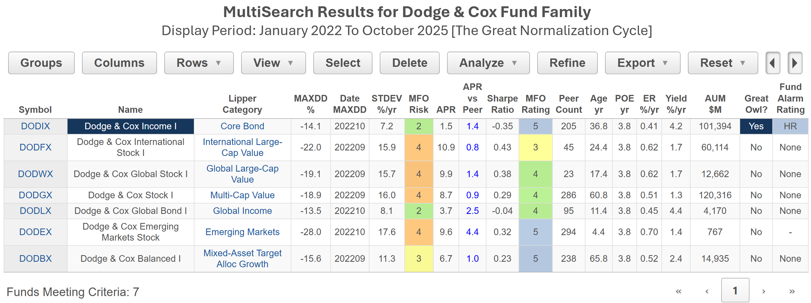 MultiSearch, our main search tool, will sort through thousands of funds based on up to 300 screening criteria. Its Pre-Set Screens provide an easy way to get a quick overview on markets and notable funds. The example below depicts risk and return metrics for the Dodge & Cox fund family during the current market cycle, coined "The Great Normalization." Only a few of the more than 1000 metrics available in the table are illustrated.