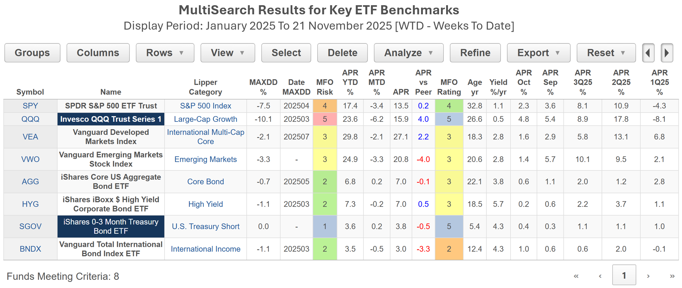 - A suite of analytics: Flows, Correlation, Rolling Averages, Up/Downside Capture, Calendar Year and Fixed Period Metrics, Batting Averages, Benchmark Comparisons, Trend and Momentum, Lipper Leaders, Category Averages and Ferguson Metrics.