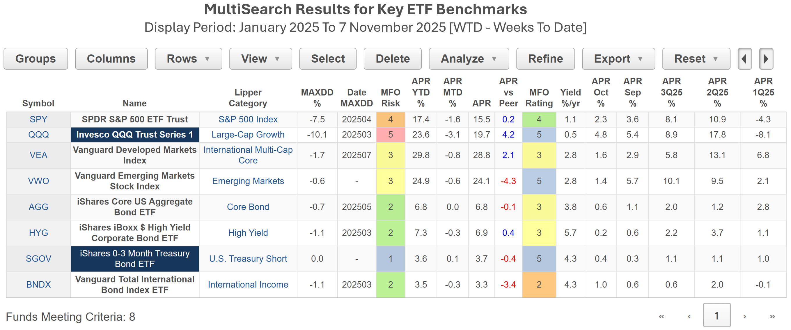 - A suite of analytics: Flows, Correlation, Rolling Averages, Up/Downside Capture, Calendar Year and Fixed Period Metrics, Batting Averages, Benchmark Comparisons, Trend and Momentum, Lipper Leaders, Category Averages and Ferguson Metrics.