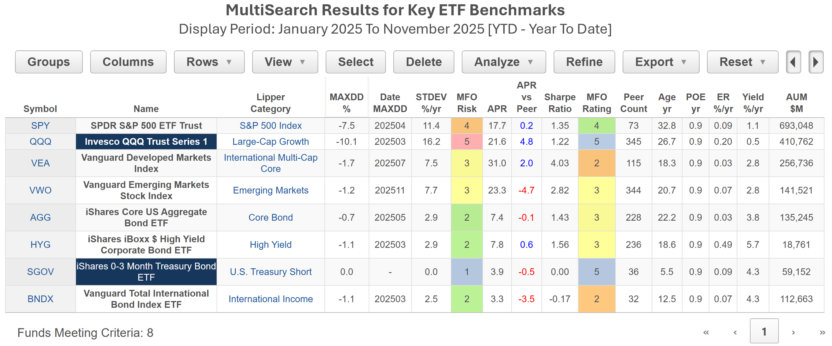- A suite of analytics: Flows, Correlation, Rolling Averages, Up/Downside Capture, Calendar Year and Fixed Period Metrics, Batting Averages, Benchmark Comparisons, Trend and Momentum, Lipper Leaders, Category Averages and Ferguson Metrics.