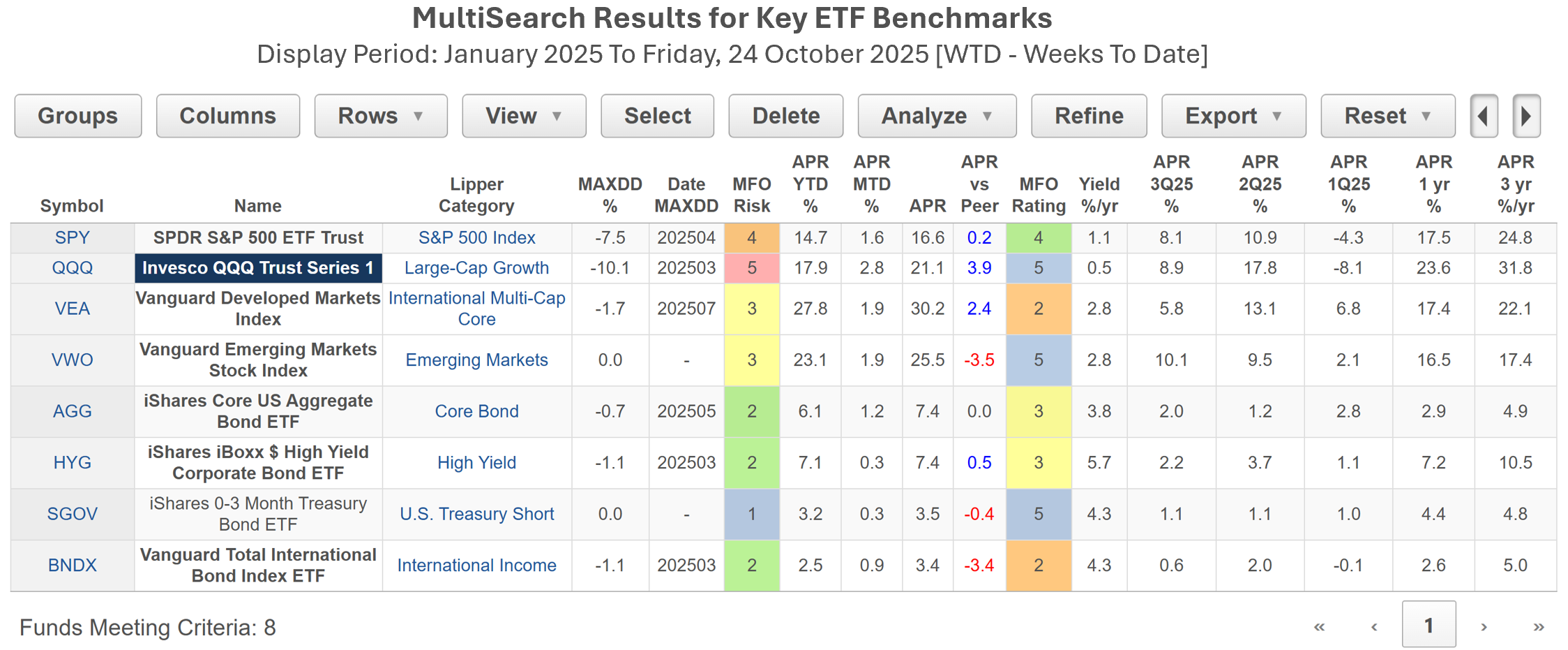 - A suite of analytics: Flows, Correlation, Rolling Averages, Up/Downside Capture, Calendar Year and Fixed Period Metrics, Batting Averages, Benchmark Comparisons, Trend and Momentum, Lipper Leaders, Category Averages and Ferguson Metrics.