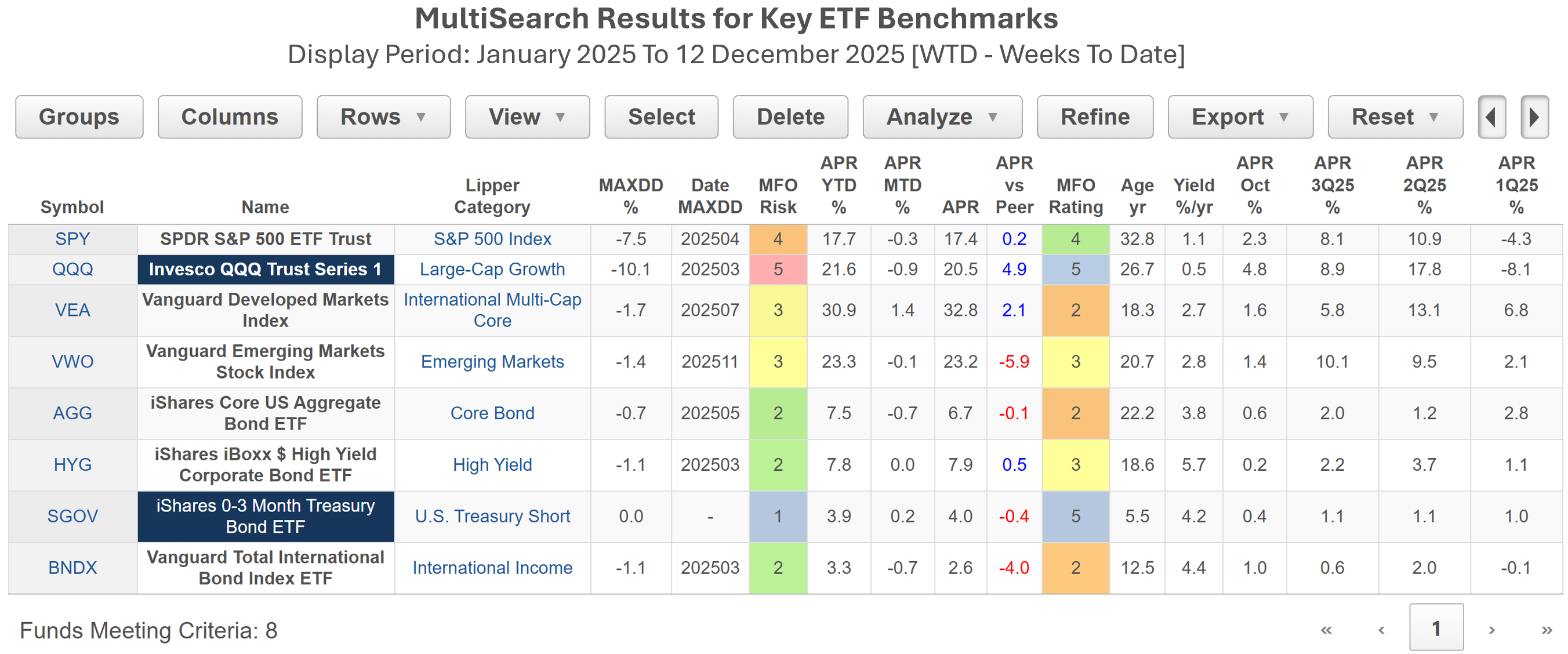 - A suite of analytics: Flows, Correlation, Rolling Averages, Up/Downside Capture, Calendar Year and Fixed Period Metrics, Batting Averages, Benchmark Comparisons, Trend and Momentum, Lipper Leaders, Category Averages and Ferguson Metrics.